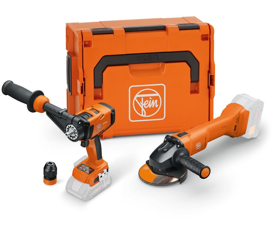 Fein ASCM 18-4 QM AS akkus fúró-csavarozó és CCG 18-125-12 akkus sarokcsiszoló (akku és töltő nélkül, L-BOXX-ban)